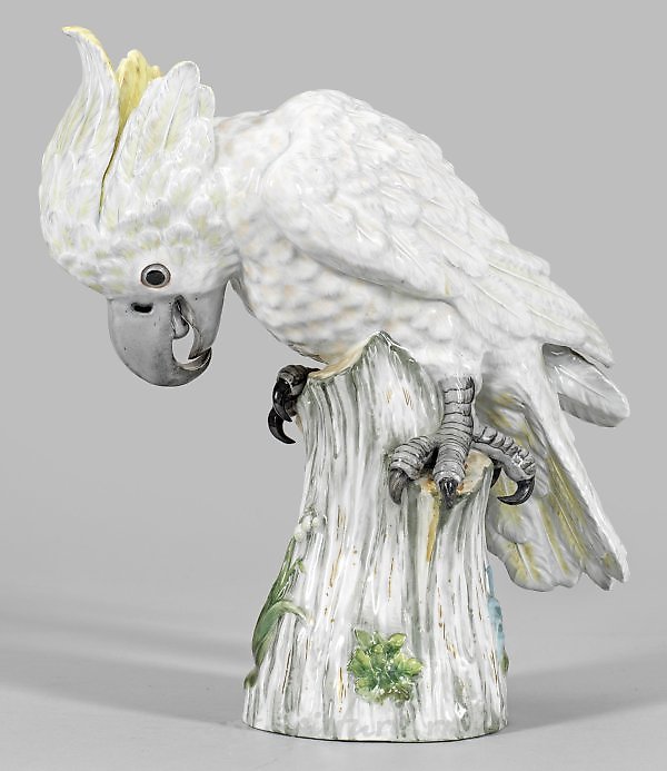 On a high, floral reliefed tree stump base, there is a sitting cockatoo with its head tilted downwards. The feather dress is reliefed, naturalistically designed, accentuated in delicate yellow, light gray, and apricot tones. Polychrome painting. Either by Johann Joachim Kaendler. Model number 1778. Minor restorations/chips; crossed swords mark. Height 34 cm. Provenance: From the estate of a significant North German private collection. A large porcelain figure of a cockatoo. Minor restored/chipped. Crossed swords mark. Meissen. 2nd half 19th century.