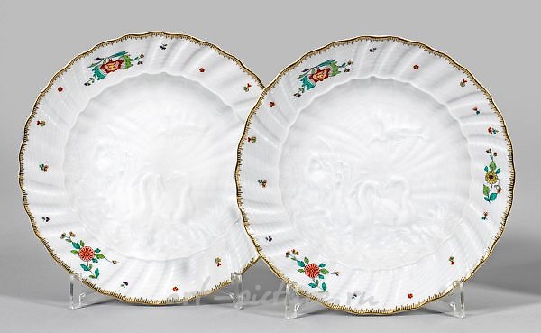 Round shape. Fine, shell-shaped relief decor from the Swan Service (Swan Service). In the recessed mirror, two swans facing each other, floating on the water, between tall standing and flying herons. On the banner, Asian flower branches and scattered flowers in Kakemono style. Combed gold rim. Sword mark. Diameter 24.5 cm. A pair of porcelain dinner plates with "Swan Service" decor. Crossed swords mark. Meissen. After 2000.