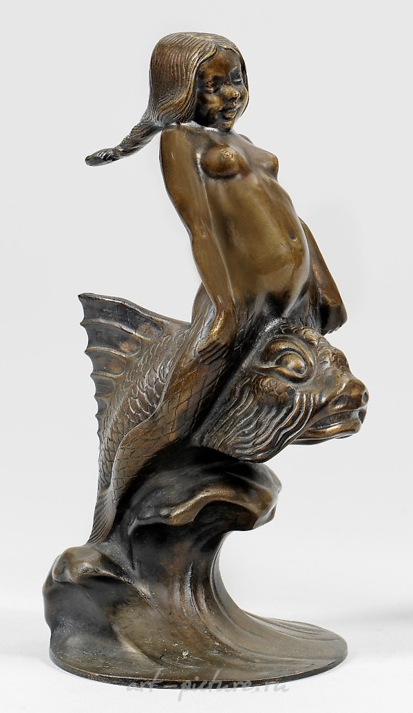 (1880 Liesing near Vienna - 1961 Vienna) A young nymph riding on a fish, bronze, dark brown patinated. Signed; a bronze created around 1914 by the renowned Viennese sculptor. Endstörfer worked in the studio of Carl Wollék until 1913, in 1915 he received the Kaiser Prize and became a member of the Künstlerhaus Wien in the same year. In 1914, a variant of the nymph with seahorses was created as a bronze sculpture, and in 1926 the stone fountain sculpture "Nixchen" was created in the Josef-Scheu-Hof in Vienna. H. 24 cm. Dark brown patinated bronze, circa 1914. Signed.