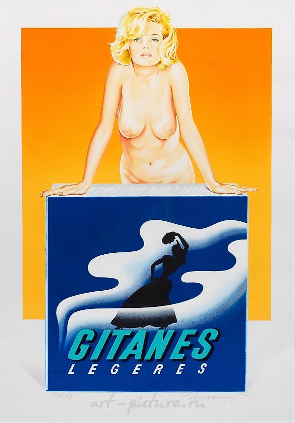 (1935 Sacramento, California, USA - 2018 in Oakland, California) "Gitanes". Original title color lithograph on paper, 1999. Signed and numbered 37/199. Published by Galerie Ernst Hilger, Vienna. Catalogue raisonné Hilger GL 2-99. As often seen in his graphic works, the American Pop Art artist also combines an enticingly erotic, feminine nude with a product of consumer culture in "Gitanes". In 1961, Remos began with comic figures and then turned to the portrayal of pin-up girls with explicit sex appeal as sales advertisements, often featuring unabashed phallic symbols. The depiction measures approximately 66.5 cm x 43 cm. Framed lithograph in colors on woven paper. Hand-signed in pencil and numbered 37/199.