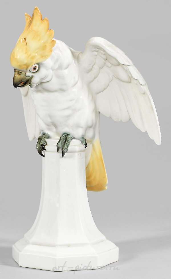 On an octagonal pedestal sits a Yellow-crested Cockatoo with its wings spread out. The underglaze painting is done in a restrained polychrome style. Possibly by Edmund Sode, 1917. Model number U 1119. Inscribed with a date (1917). Manufacturer's mark. Height: 42 cm. Provenance: From the estate of a significant private collection in Northern Germany. A Thuringian Art Nouveau figure of a cockatoo. Incised designer's signature. Manufacturer's mark: Thüringen, Unterweißbach, Schwarzburger Werkstätten. Circa 1926-1936.