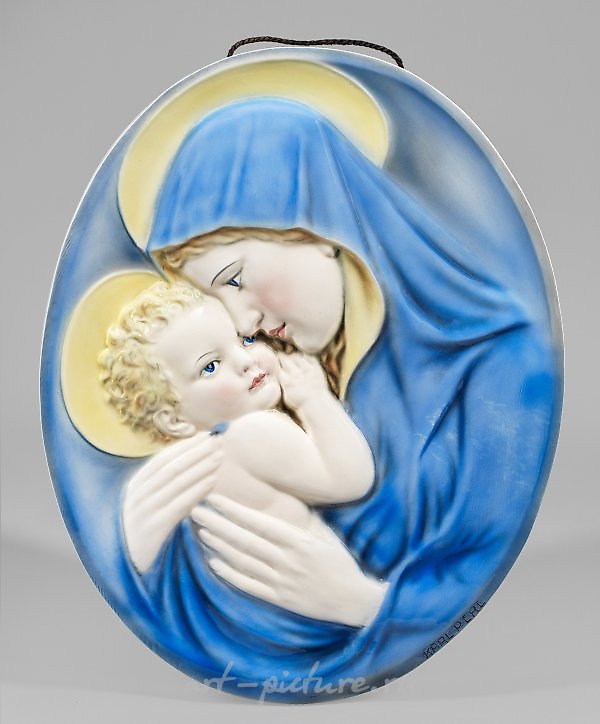 Stoneware, polychrome underglaze painting. Oval relief, with two original hanging holes above. Either by Karl Perl, marked "KARL PERL"; triangular company mark with "MADE IN AUSTRIA" inscription. Approximately 49.5 cm x 39 cm. An Austrian Vienna glazed and painted earthenware wall relief of Madonna and Child by Keramos. Austria. Vienna. Keramos - Viennese art ceramics and porcelain manufactory. 1928 to 1940.