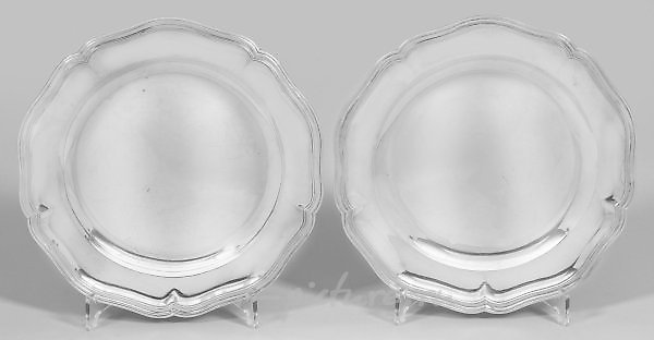 Silver. Small, deep, smooth mirror, transitioning into a wide, curved flag. Flower-shaped, drawn in and curved, with multiple profiles on the edge. Engraved initials "A.D." on the underside. Gestural, tremolo stroke, inspection marks (1764-1771), master's mark "MD", stamp of Prince Bishop Carl Nicolaus Alexander von Oultermont (1763-1771), year letter "F". Weight approximately 1210 g. Diameter 24.5 cm. See Rosenberg, Volume IV, Numbers 5353, 5354, 5412. A pair of rare and heavy Belgian Baroque silver plates. Monogrammed. Tested, assayed, and marked by the master "MD". Assay mark of Prince Bishop Carl Nicolaus Alexander von Oultermont (1763-1771) and date letter "F". Belgium. Liège. 1769.