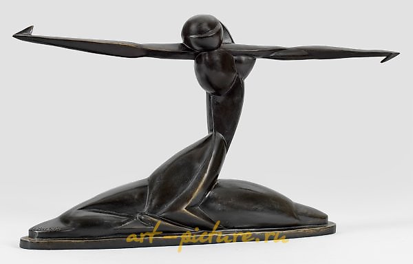 (1881 Haynau - 1946 Internment Camp Teplice/Teplice) after "Enjoyment". Original title Bronze, dark patinated. Inscribed; posthumous, contemporary cast, late 20th/early 21st century, after the cubist bronze created around 1920 by the sculptor. In 1915, Herzog first exhibited in Herwarth Walden's "Sturm-Galerie" in Berlin and subsequently belonged to his favored sculptors - in 1919, he counted him among the most important sculptors alongside Alexander Archipenko and William Wauer. After World War I, Herzog joined the November Group, 1919-1933, he regularly participated in the Great Berlin Art Exhibition, also multiple times in the exhibitions of the Academy of Arts. After 1933, Herzog was one of the artists stigmatized as "degenerate" by the National Socialists. H. 36.5 cm. An example of the original bronze is located in the Berlin Gallery (Inv. No. BG-S 3999/87). After Oswald Herzog (1881-1946). Dark patinated bronze. Inscribed. Posthumous, contemporary cast, late 20th/early 21st C.