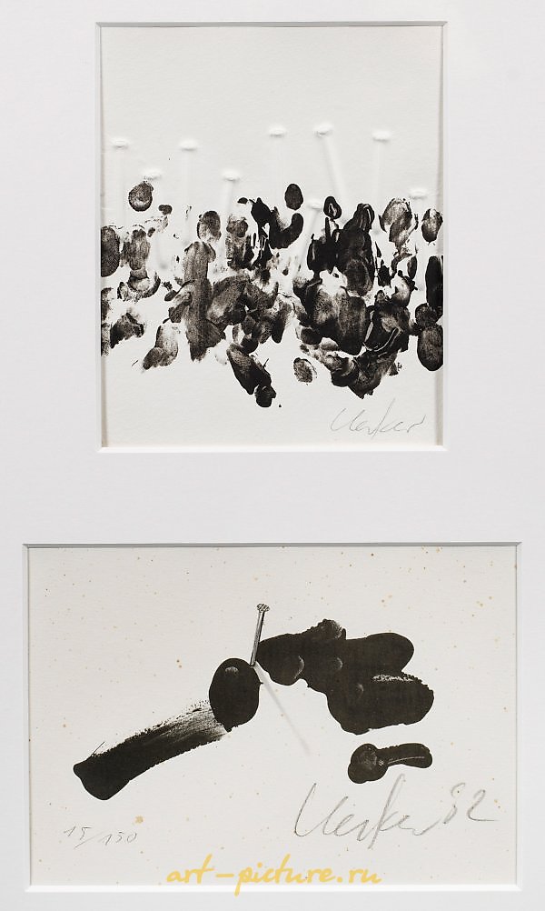 (Born 1930 Wendorf/Mecklenburg. Based in Düsseldorf) Two graphics. One lithograph on laid cardboard with nail embossing "No Error in the System", 1978, edition of 155 copies, signed; one offset lithograph on paper, 1982, signed, dated, and numbered 15/150. Mat opening measures 20.5 cm x 17 cm and 16.8 cm x 24.8 cm. Offset sheet is blotchy. Framed in a collection frame. Two prints. One with lithograph and embossing on paper, the other offset lithograph, 1978 and 1982. Each hand-signed, one dated (1982) and numbered 15/150. Stains to the offset lithograph.