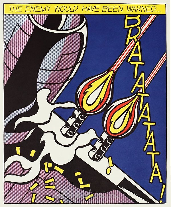(1923 New York - 1997 ibidem) after "As I opened Fire". Original title Poster-Triptychon consisting of three color offset lithographs on paper. Published by Stedelijk Museum, Amsterdam. Catalogue raisonné Döring/von der Osten 14. Verso each with typographic annotation "edition and color-correction (/) Stedelijk Museum, Amsterdam (/) © R. Lichtenstein 1964 c/o Beeldrecht Amsterdam (/) printed in the Netherlands", "ROY LICHTENSTEIN 1923 (/) as I opened fire (/) 1964 - acrylic on canvas / triptych - panel (...) (/) coll. Stedelijk Museum Amsterdam". The triptych, reproducing Lichtenstein's painting from 1964, was printed for the benefit of the museum, only a small part of the three editions (1966, 1974, and 1983) were signed. Each sheet measures approximately 64.2 cm x 53.2 cm. A triptych of three offset lithographs in colors on woven paper, published as posters in three editions (1966, 1974, and 1983) by the Stedelijk Museum, Amsterdam.