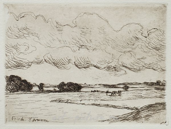 (1869 Braunschweig - 1956 Groß-Borstel) Two graphics etching / paper. Signed in the plate, once dated (19)27. Landscape or painter with umbrella at work. Later prints. One sheet with foxing. Plate size approximately 9 cm x 11.5 cm. Framed.