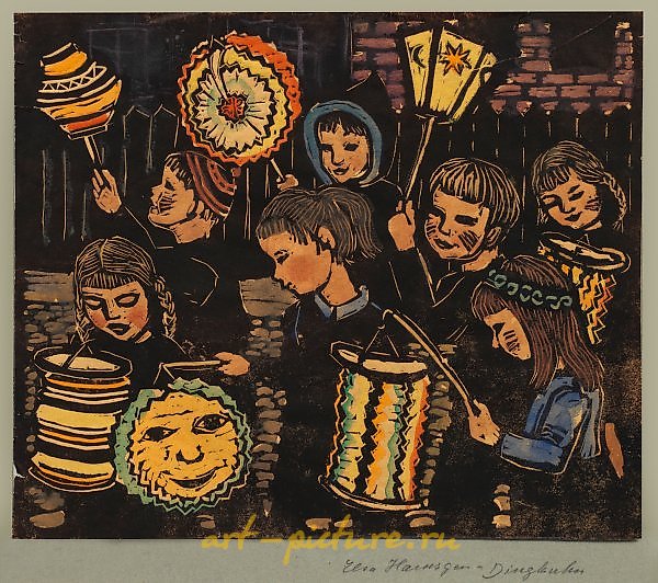 (1898 Flensburg - 1991 Hamburg) Lantern procession sheet, large color linocut on thin paper. Signed on the backing cardboard. Cheerful motif by the artist, who particularly enjoyed depicting children, including during lantern processions. She studied in Hamburg from 1919-1922 and has worked as a freelance painter and graphic artist since 1923. She had numerous exhibitions, including at the Hamburg Secession. Gustav Pauli, director of the Hamburg Kunsthalle, also acquired her works. German. Minor tears to the margins. 26.5 cm x 31.5 cm. Lino cut in color on thin paper. Signed on the backing cardboard.