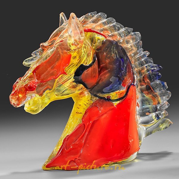 A fully sculpted sculpture made of colorless and polychrome glass, partially with flat applications, various threads as one and melting. Undecipherable signature; H. 24.8 cm. A modern Italian Murano glass sculpture of a horse head. Italy. Murano. End of the 20th century.