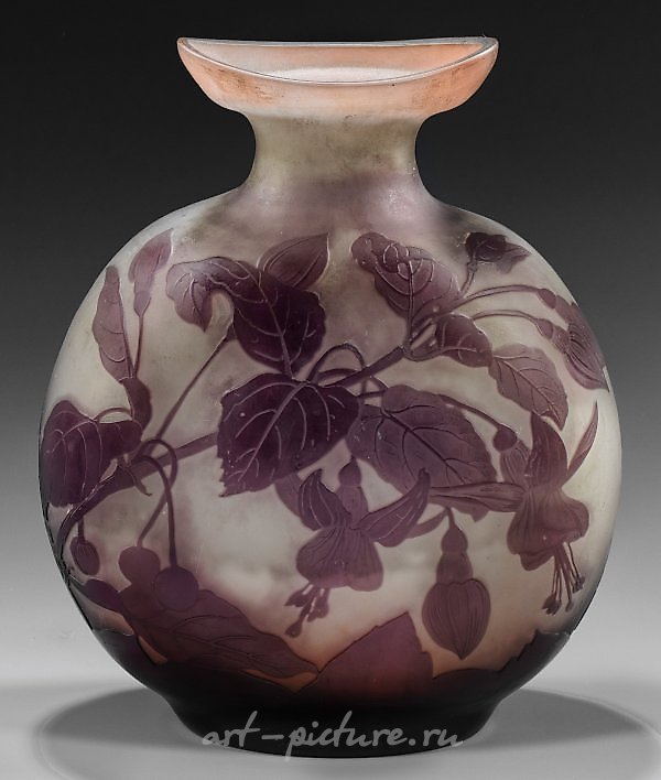 Round, flattened bottle shape with a stepped, navette-shaped mouth. Overlaid glass, colorless, whitish opalescent and violet. Decor executed in multiple steps, etched and polished. Signed "Gallé" with a star. Height 22 cm. A French Art Nouveau cameo glass vase by Gallé with acid-etched decor of fuchsias. Signed "Gallé" with a star. France, Nancy. Emile Gallé. 1905-1908.
