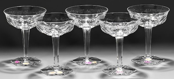 Colorless cut crystal glass. Six-sided foot, the shaft corresponding six-fold peeled, the transitional cut on the wide, bell-shaped cup ending in round arches. Either 1916 (initially as "Schönbrunn", since 1918 "Gloriette"). On four glasses violet-silver-colored company label for the 100-year anniversary with date 1857-1957 and gold-silver-colored label with designation "FIRST QUALITY"; one glass with labels "Moser", "FIRST QUALITY" and "MADE IN CZECHOSLOVAKIA". H. 13 cm. Five Moser "Pope" cut crystal champagne coupe glasses. Four glasses with 100-year anniversary Moser factory label (1857-1957), two glasses with "Moser" acid factory mark and one glass with "Moser" factory label. Czechoslovakia. Karlsbad/Karlovy Vary. Around 1957-1960.