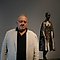 On a high cubic pedestal stands a life-sized male figure. The head is extended forward, with the right hand pulling at the collar of the shirt.