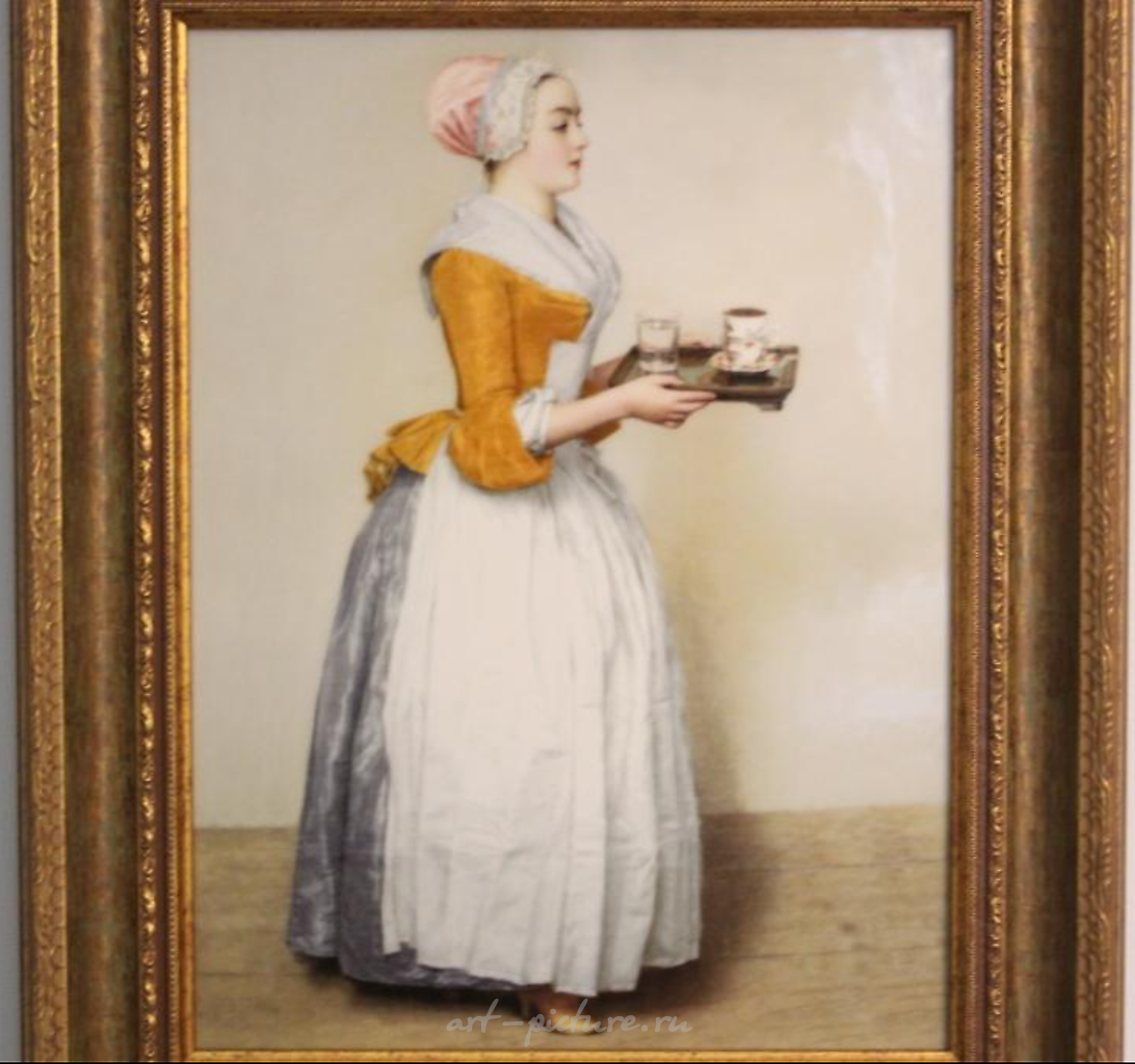 "But with the most natural grace. Her little foot in a gray shoe with a high heel modestly peeks out from under her skirt. The colors of the "Chocolatier's" clothing have been chosen by J.-E. Liotard in a soft harmony: a silvery-gray skirt, a golden corset, an apron shining with whiteness, a transparent white kerchief, and a fresh silk cap – pink and delicate like a rose petal... The artist, with his characteristic precision, does not stray in the slightest from the most detailed reproduction of the form of the "Chocolatier" and her attire. For instance, the dense silk of her dress sticks out quite realistically; the folds of the apron, just taken out of the linen drawer, have not yet smoothed out; the glass of water reflects the window, and in it, the line of the upper edge of a small tray is mirrored.