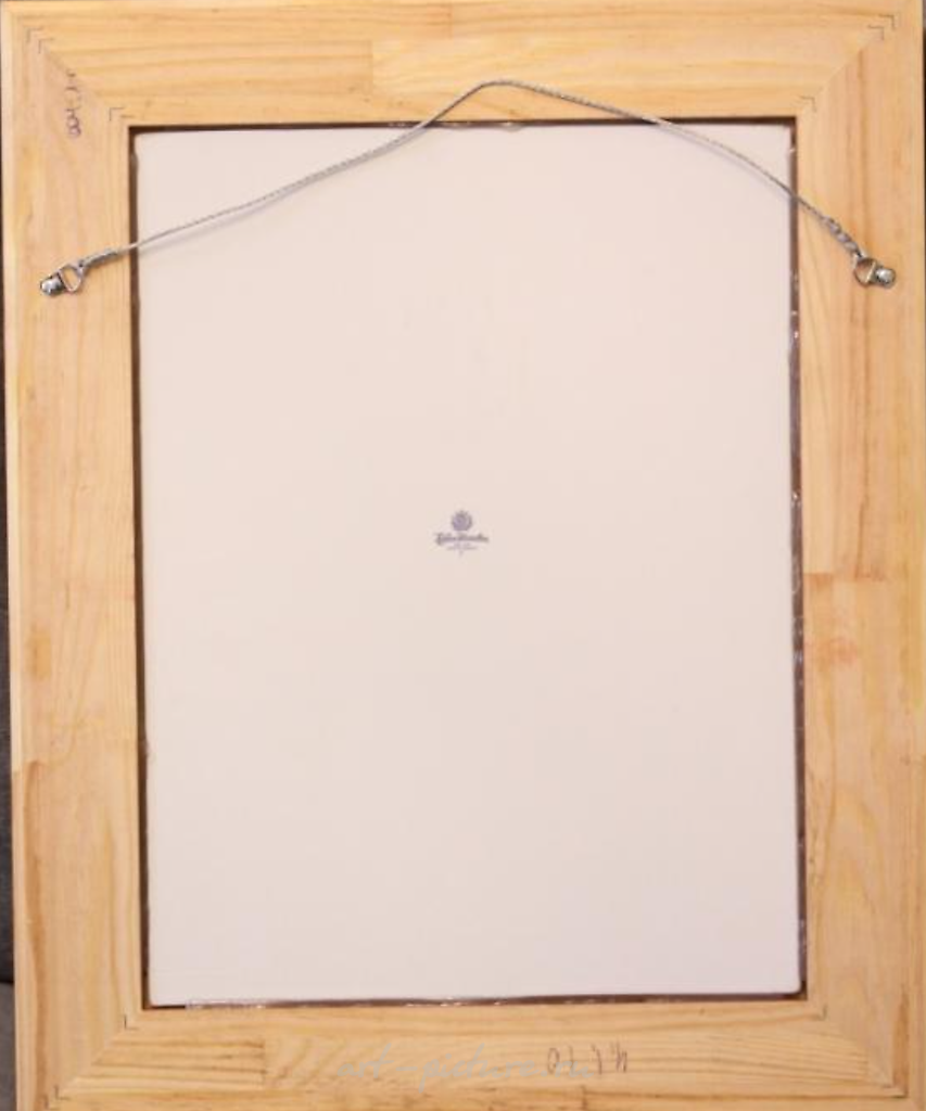 Chocolate Girl in Porcelain - Painting by Weimar, Germany RARE PORCELAIN PLAQUE IN A WOODEN FRAME. PLAQUE SIZE: 30 cm x 40 cm; FRAME SIZE: 43 cm x 53 cm GERMANY. PRODUCED BY THE GERMAN MANUFACTORY WEIMAR, FOUNDED IN 1790. FRAMED IN AN ITALIAN WOODEN FRAME WITH HAND-PAINTED DETAILS. A COPY OF THE FAMOUS PAINTING BY Jean Étienne Liotard, titled "THE BEAUTIFUL CHOCOLATIER" from the Dresden Gallery. The Swiss painter J. É. Liotard was known as "the painter of kings and beautiful women." The portrait of the beautiful Anna Baltauf, known worldwide as "The Chocolatier" (French: "La belle chocoladiere"), is one of his most celebrated works. Anna was likely a maid at the court of Empress Maria Theresa of Austria, where the painter first noticed her. Anna, the daughter of a fallen knight, served as a chambermaid at the court. It is said that it was there that her beauty caught the eye of young Prince Dietrichstein. He fell in love and - to the horror of the aristocracy - married her. As a wedding gift, Prince Dietrichstein commissioned Jean Étienne Liotard, who was working at the Viennese court at the time, to paint a portrait of his fiancée in the very dress she wore when he first saw her. Legend has it that on the day of the wedding, the bride invited her acquaintances, chocolatiers, and, delighted with her elevation in status, extended her hand to them, saying: "Look! I am a princess now, and you may kiss my hand." This painting is also remarkable because it features the first porcelain in Europe - Meissen. The painting depicts only one female figure. However, she is portrayed in such a way that she captivates most viewers visiting the famous gallery in Dresden. J.-É. Liotard managed to give the painting the character of a genre scene. In front of the "Chocolatier" is an open space, creating the impression that the model is not posing for the artist but walking before the viewer with tiny steps, carefully and cautiously carrying a tray. The "Chocolatier's" eyes are modestly cast down, but her awareness of her appeal illuminates her tender and charming face. Her posture and the positioning of her head and hands all contribute to her allure.Here is the translated text into English: