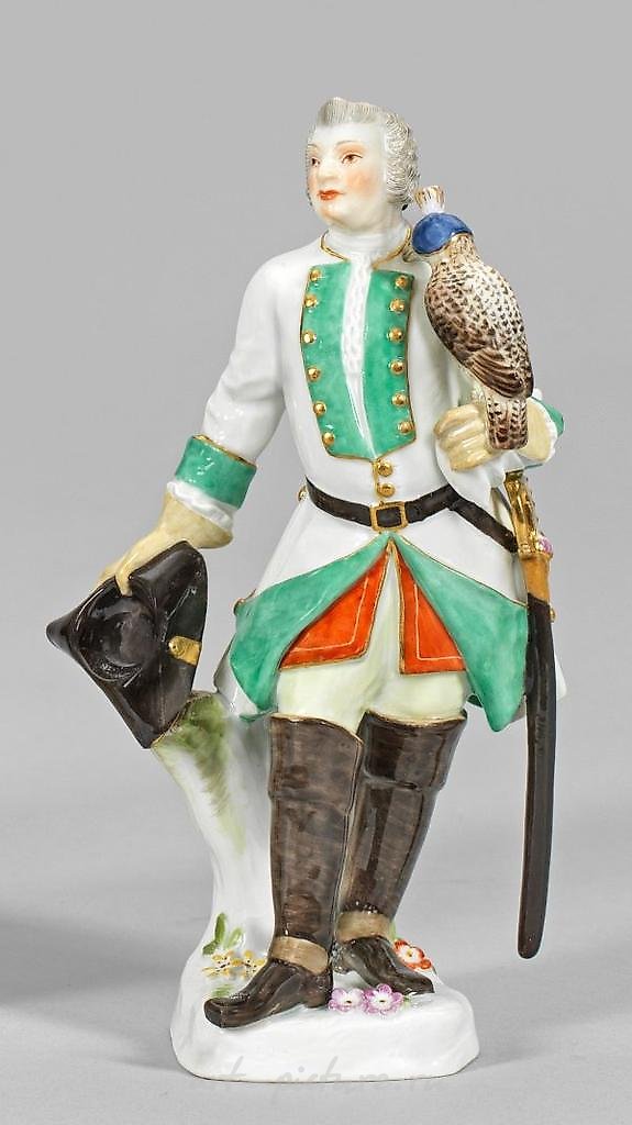 On a rectangular pedestal stands a falconer in a white, light green-trimmed coat, holding a trident in his right hand. On the left, a falcon sits. The polychrome painting is adorned with gold staffage. Possibly by Johann Friedrich Eberlein. Model number 512x. Some insignificant restoration; crossed swords mark. Height 18 cm. A porcelain figure of a falconer. Insignificant restoration. Crossed swords mark. Meissen. Circa 1935-1945.