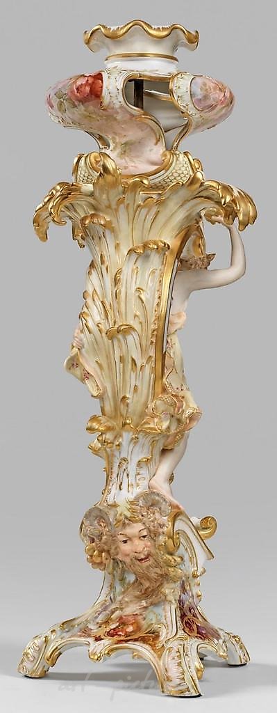 Magnificent neorococo candelabrum shaft with a female figure of the KPM Berlin, two-part assembly. On three leaf-shaped feet, a three-sided, rocaille-shaped raised and cornice-like base with a relief sculptural, horned mask on the back, transitioning into a heavily crafted shaft made of lush reed leaves and a large, C-shaped volute clasp. There is a dynamically incorporated, antiquarian figure of a young lady in a bent position, holding onto the reed leaves with her raised right hand. Dressed in a delicate yellow gown patterned with gold-shaded purple flowers, bordered with latticework, flowing gracefully. Above it is the bulging, three-times pierced finish with a flower-shaped rim. Encircling the base are cartouche-like, surrounded by fine relief gold lines, impressionistic floral still lifes of anemones, azaleas, pansies, and dog roses in polychrome, pastel-colored floral painting, known as soft painting by the porcelain painter Franz Aulich. Subtle coloring in rose, apricot, and green, partially with shell motifs and rich gold accents. Model development by Prof. Louis Sußmann-Hellborn, predecessor of Alexander Kips (1885), modeled by Heinrich Monno and Robert Schirmer (1885). Signed at the bottom: 'F. Aulich'.