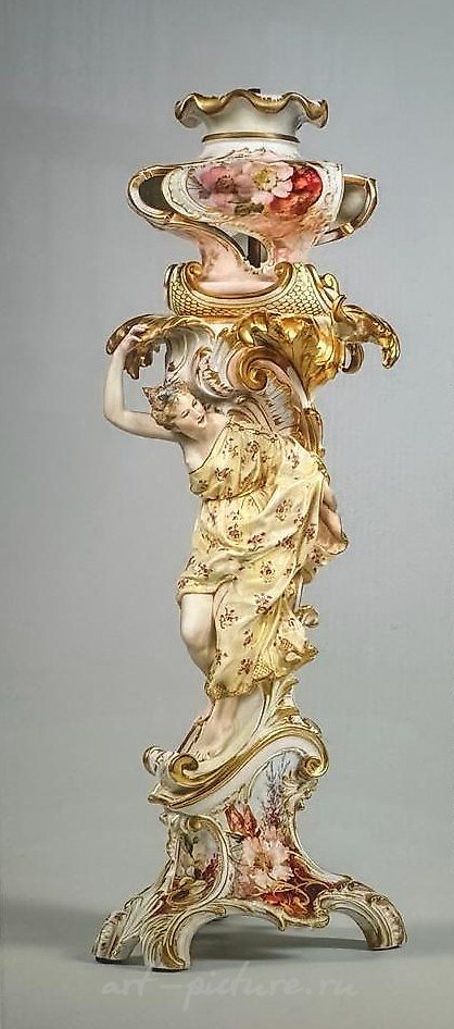 На изображении мы видим великолепное изделие из фарфора, принадлежащее к элегантному стилю неорококо. Это не просто предмет, а настоящая симфония искусства, созданная руками мастеровых с величайшим вниманием к деталям. Как человек, который не только сам создает художественные произведения, но и любит изучать другие виды искусства, я не могу не восхищаться мастерством и изяществом, с которыми выполнены эти фарфоровые изделия.