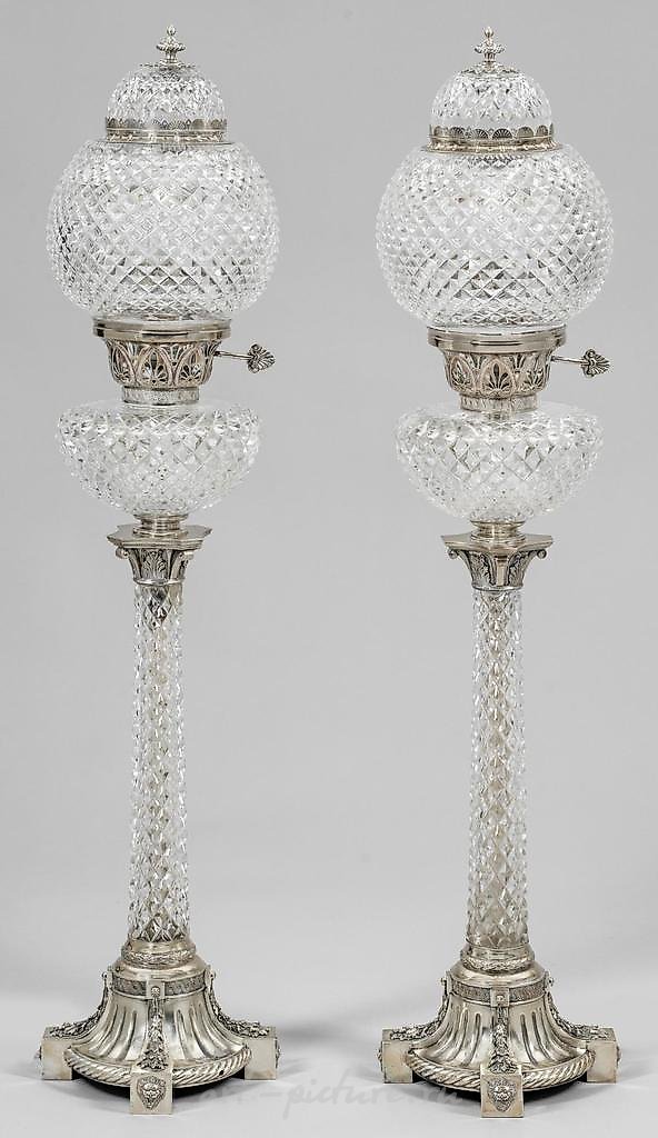 1 - f l g . ; Colorless, cut crystal glass with silver mounting. Four square-shaped feet, adorned with appliqued, relief oak leaves and lion heads, transitioning into trumpet-shaped stands, surrounded by fluting and corded bands. Above, a relief-plastic laurel wreath rises conically on a column shaft made of colorless crystal glass, adorned with richly cut stones and facets, embellished with four-fold drawn-in and adorned with acanthus leaves, silver capital. Above that, a baluster-shaped attachment with palm leaf-like pierced work as a carrier for the light source. Spherical lampshade made of corresponding cut crystal glass with a convex lid and crowned by a mounted baluster knob above a leaf rosette. Electrified. Signed, certified by the master craftsman Olek Lev Fedorovich (1890-1896), dated, manufacturer's mark. H. 81 cm. See Postnikova-Losseva, 1995, No. 2022, 2121, 3055. A pair of large and decorative Russian Empire style silver-mounted cut crystal glass table lamps. Electrified. Standard mark 84, assay and assay master's mark, maker's mark, dated. Russia. Moscow. Shanks & Co. 1895.