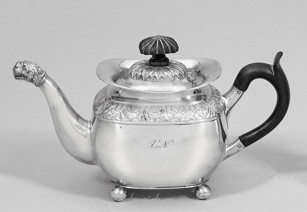 Silver. Over four exhibited ball feet, bulging, almost rectangular body with rounded corners and wide exhibited edge. Shoulder framed by a broad, reliefed acanthus leaf frieze. Deeply set, conical, ending in a lion head spout. Slightly hood-like hinged lid with gadrooned wooden knob over a rosette of finely punched lancet leaves. Side ear handles made of ebonized wood. On the wall monogram "VN". Designed, marked, master Heinrich Anthon Schauenburg (active since 1819). Approximate weight 425 g. Height 15.5 cm. Compare Schliemann, Vol. II, BZ 93, No. 585, Vol. III, p. 236, fig. 583 (similar type). A rare German Biedermeier silver teapot by Heinrich Anthon Schauenburg (active since 1819). Monogrammed. Assay and master's mark. German. Hamburg. Around 1835.