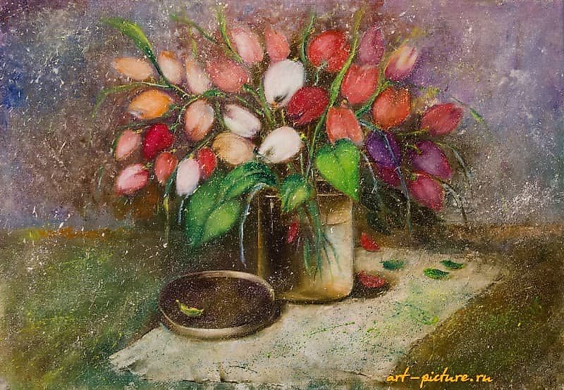 The painting "Snowy Tulips" is executed on a canvas measuring 35*50 cm in oil. The spring flowers dusted with March snow convey an unusual mood of joy and celebration. The artwork can be a wonderful gift and a decorative piece for the interior, lifting your spirits while reminiscing about the past, looking at the fallen leaves, and delighting in the vibrant, live spring tulips.