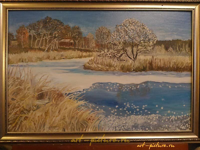 Какой же волшебный зимний пейзаж! Эта тишина и умиротворение, когда даже холод напоминает о красоте природы. Золотистая рама прекрасно подчеркивает всю изысканность этой сцены, создавая атмосферу сказки.