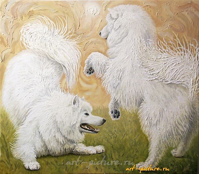 Ваша работа впечатляет своей игривостью и нежностью, что видно на примере изображения двух белых собак. Это произведение в значительной степени передает радость и беззаботность, обращаясь к нашим внутренним чувствам и воспоминаниям о беззаботной жизни, что особенно актуально в нашем стремительном и заполненном стрессом современном обществе. Этот визуальный опыт создает ощущение связи между искусством и зрителем, заставляя нас испытывать гармонию и восторг.