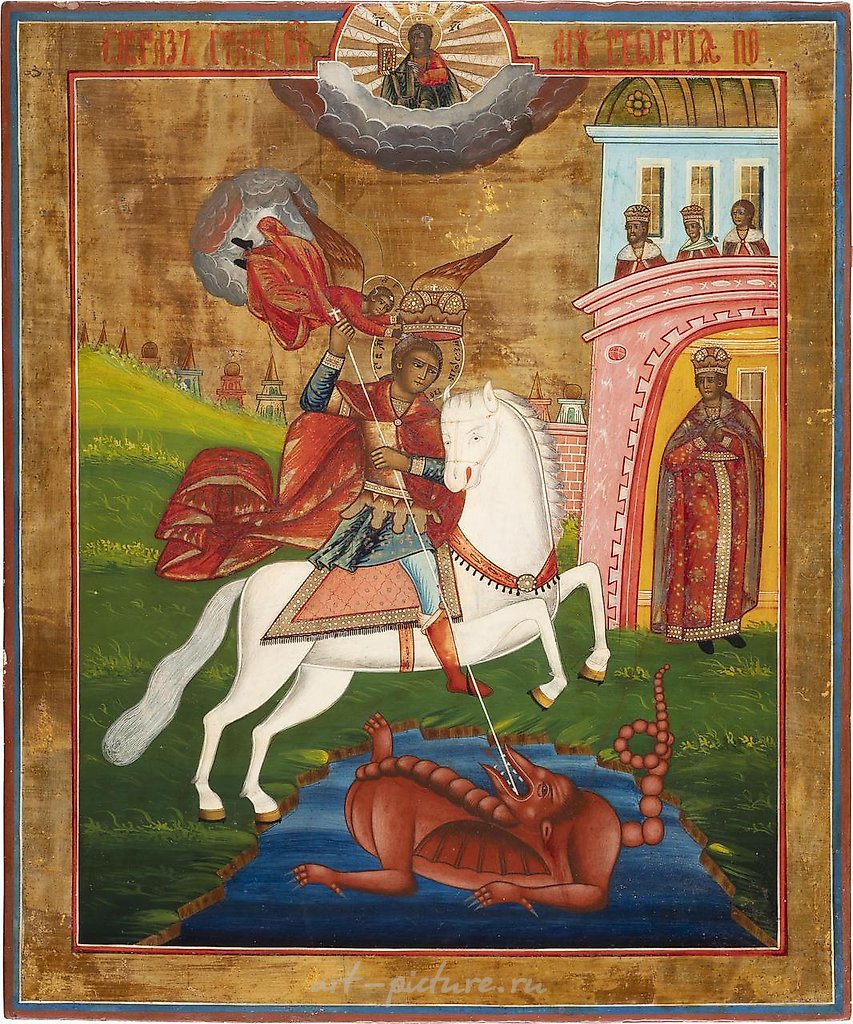 A LARGE ICON SHOWING ST. GEORGE KILLING THE DRAGON Russian, Vetka, 19th century Tempera on wood panel. The background and border made of silver, covered by a golden lacquer. Minor areas of retouching, worm holes on the reverse. 44.4 x 37.4 cm. GROSSFORMATIGE IKONE MIT DEM HEILIGEN GEORG DEM DRACHENTÖTER Russia, Vetka, 19th century