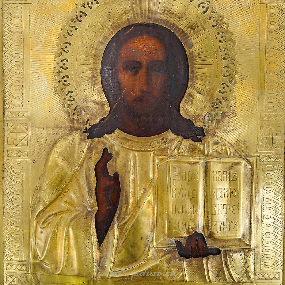 DESCRIPTION: An antique Russian icon depicting a painting of Jesus Christ holding a prayer book, a gilt overlay displaying an elaborate open pierced crown, robe, and book, further bordered by trinity patterns. CIRCA: Late 19th to Early 20th Century. ORIGIN: Russia. DIMENSIONS: H: 10.5" W: 8.75". Have a similar item to sell? Reach Out: https://www.akibagalleries.com/consign. CONDITION: