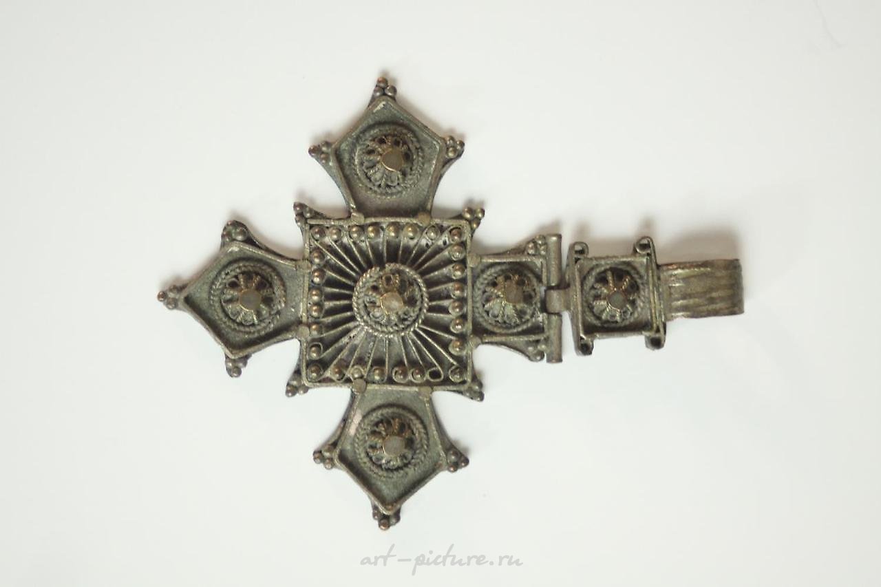 Two silver plated filigree wirework cross pendants along with a novelty miniature silver coin ashtray made of a Russian and Egyptian coin. HL.8 W.6cm. (largest)