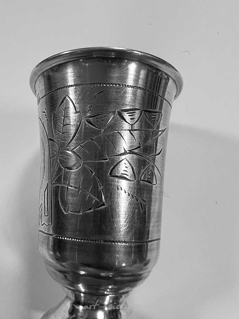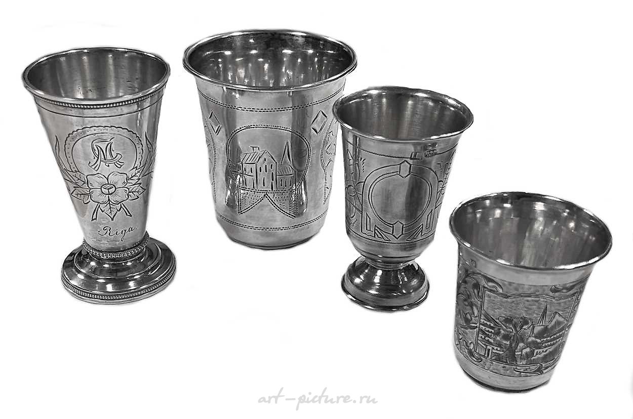 Four Russian metalwares silver vodka tumblers, all with 84 zolotniki mark for 875/1000 standard silver; the first, maker's mark not traced, assayed by Anatoly Apollonovich Artsybadhev, Moscow 1893, of campana form, the side decorated with foliate engraving, raised on a short pedestal foot, 4.3cm at the rim, 6.5cm high; the second, marker's mark