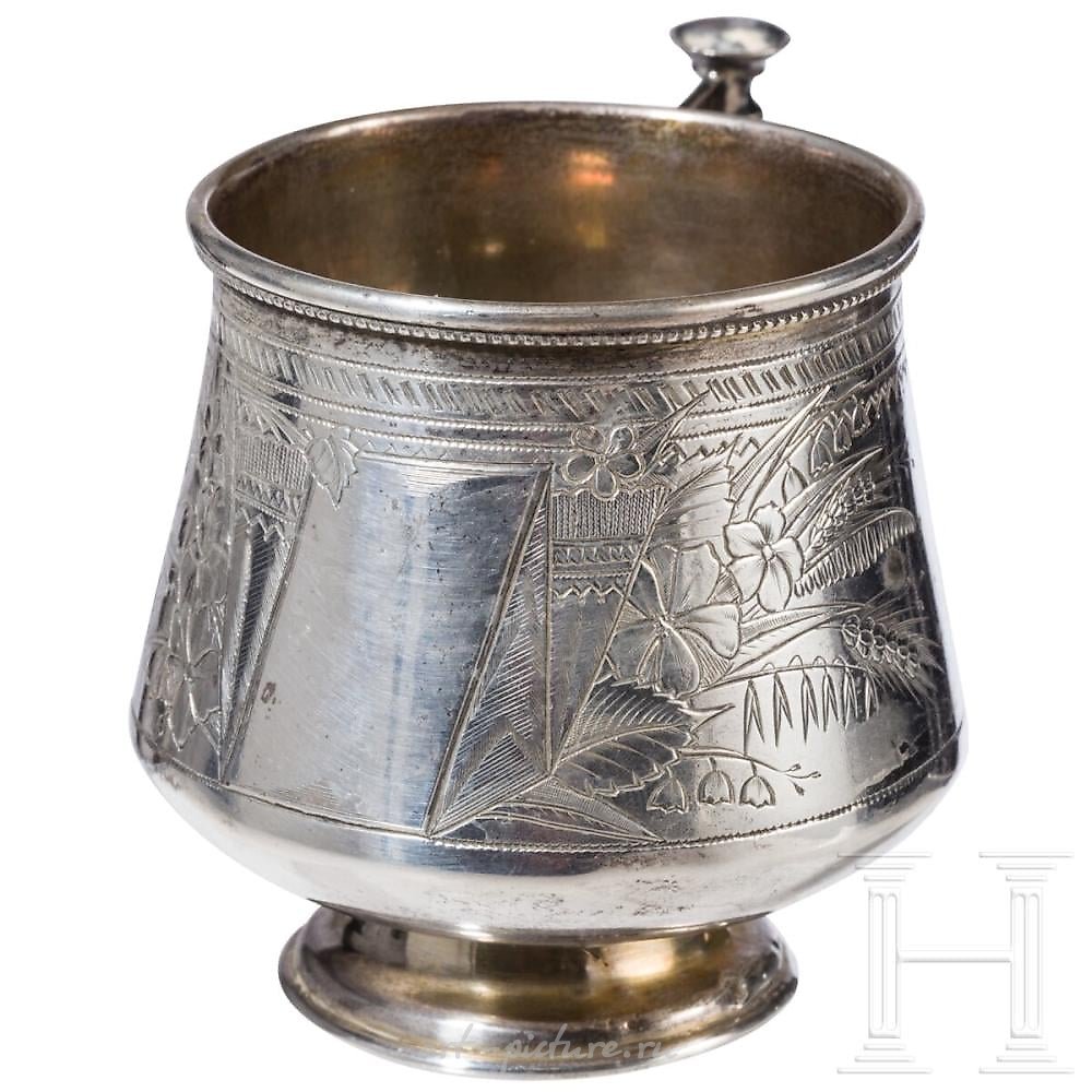 The body is engraved with flowers. Bottom with a stamp, 84-standard, the stamp of assey A. Romanov "AR 1887" and the master brand "VI" in Cyrillic. Dimensions 7 x 8.5 x 6.7 cm, weight 92.83 g. Comp