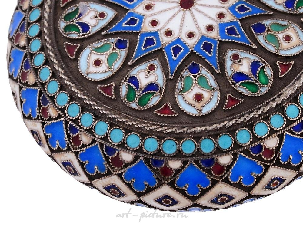 A Russian silver trinket or pill box with a hinged lid. The round casket features an ornamental cloisonne enamel design in blue colors. The lid is adorned with a hand-painted miniature painting, depicting a panoramic view of the Novodevichy Monastery in Moscow. The item has a gilt interior. The hallmark of 88 silver standard and the maker's mark can be found on the inside. Total weight: 61 grams. Russian Silverware Jewelry And Vanity Decor