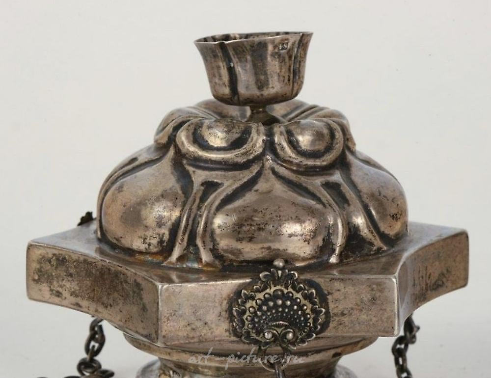 ORIGINAL IMPERIAL RUSSIAN 84 SILVER THURIBLE CENSER /LAMPADA. Imperial Russian 84 Silver Thurible Censer/Lampada. Censer has distinct hall marks, marked 84 zolotnik Assayer Dmitri Tverskoy, ST. Petersburg, 1847. 24" long with chain. Censor only: 3.75"H x 4.75"W. All 84 Silver including chain. Weight: 9