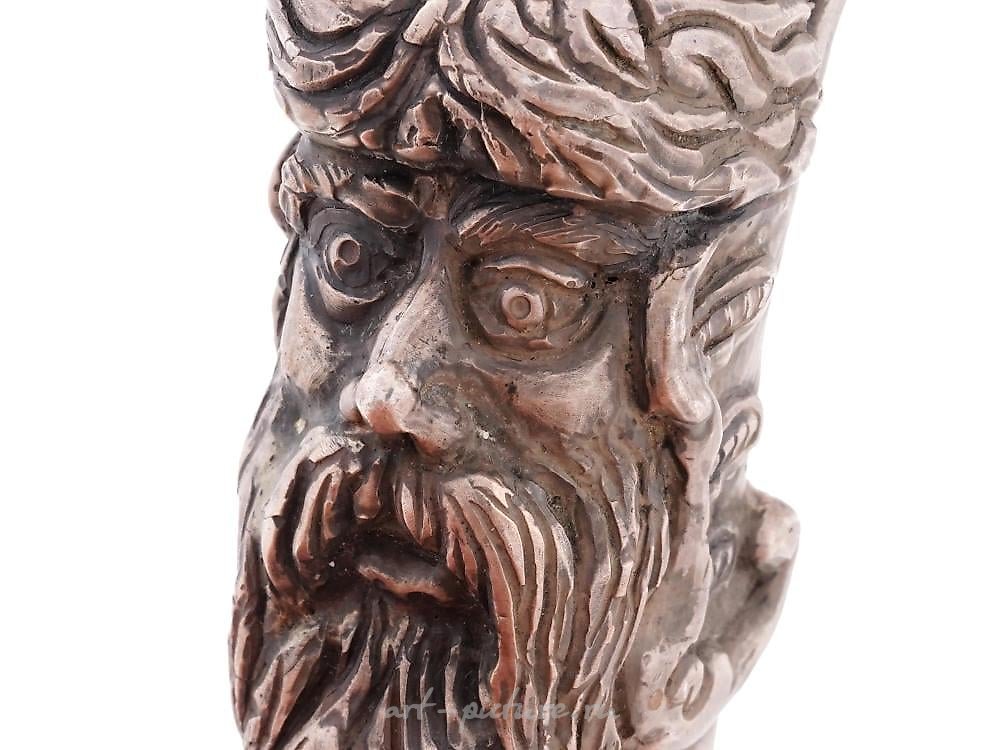 A large Russian 84 Silver cast arched cane handle. The handle is made in the form of an old man with a beard in a fur-lined cap, engraved with detailed patterns. Marked with a standard Russian 84 Silver hallmark, a maker's mark, and other marks, inside. Weight: 179 g. Russian Silver Wares and Accessories For Collectors.