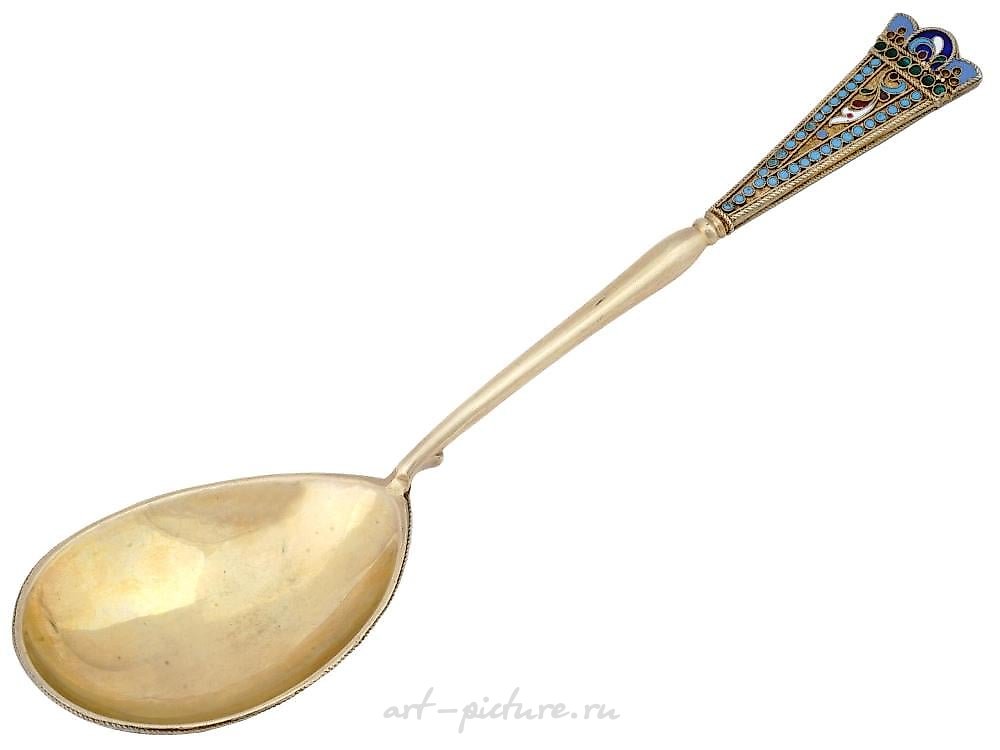 A Russian 84 gilt silver and enamel serving spoon. The reverse surface of the spoon is embellished with polychrome floral, foliage, and geometrical patterns made in the Cloisonne technique. The handle features foliage and geometrical motifs made in the same technique. Marked with a standard silver hallmark and a maker's mark. Weight 88 grams. Russian Silver Table Wares, Accessories, and Collectibles.