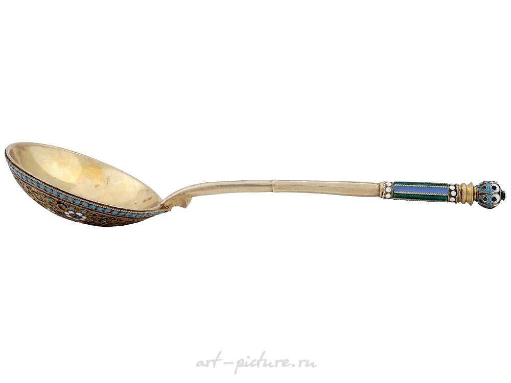 A Russian gilt silver serving spoon or ladle. The back of the bowl and handle tip are garnished with polychrome cloisonne enamel ornaments. Hallmark of 84 silver standard and maker mark are on the handle. Weight: 84 grams. Collectible Russian Silverware, Flatware And Cutlery.