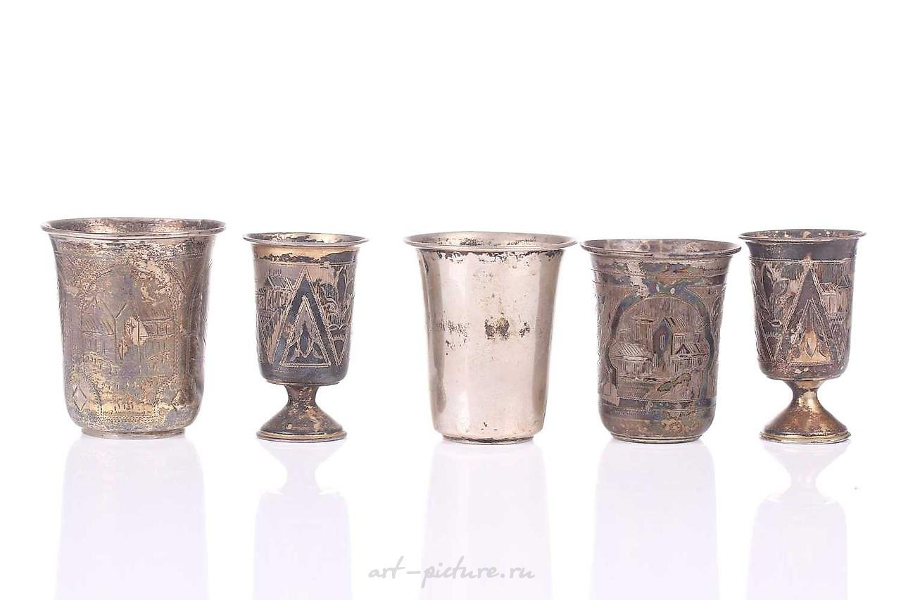Тhree pairs of Russian silver vodka cups, each engraved with buildings and foliage, a set of six Russian silver vodka cups, engraved with foliage framing a vacant cartouche, two Russian silver cups with stylized bird handle, a silver beaker, a silver salt with glass liner, and a silver filigree model of a three-masted ship. Qty: 17
