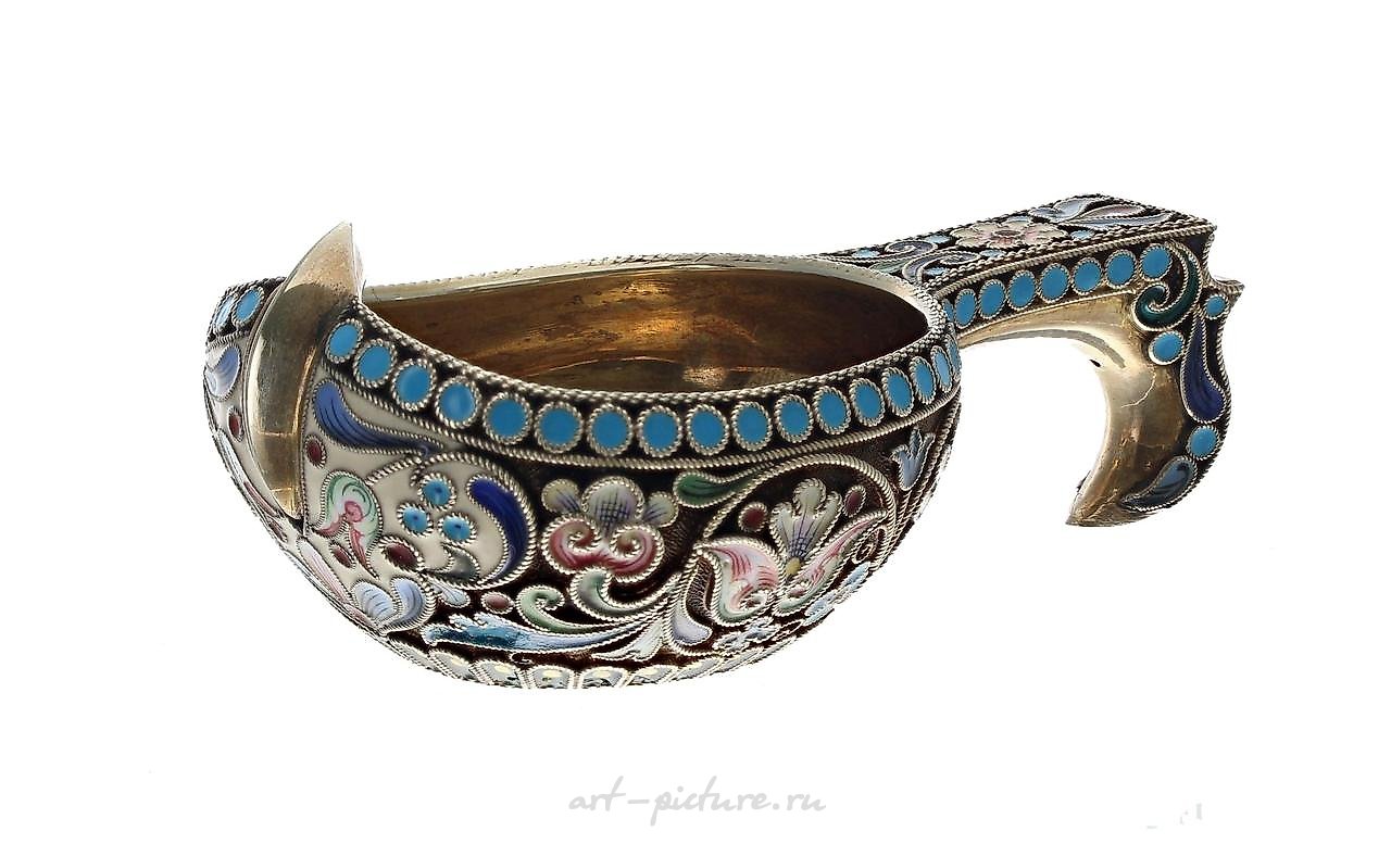 Russian silver-gilt and cloisonné Kovsh by KHLEBNIKOV, decorated with scrolling flowers and scrolling foliate borders, stamped maker's name to the underside, 84 standard, 3.5" wide, 2.1oz t