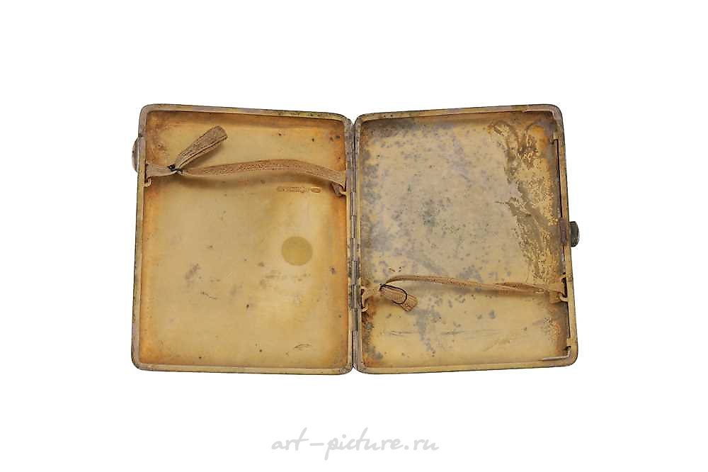 A Nicholas II early 20th century Russian 84 zolotnik silver cigarette case, Moscow post-1908 by The Association of Moscow Goldsmiths Artels. Of rectangular form with rounded corners, push button release, the front right corner applied with a bridled horse's head. Gilt interior. Marked to each side on interior, small kokoshinik to horse's head, maker's mark AOAMЗ. Length – 11.6 cm / 4.6