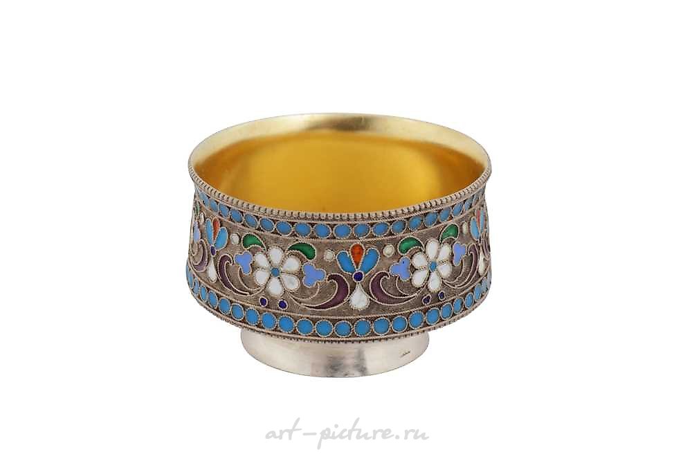 A Nicholas II late 19th / early 20th century Russian 84 zolotnik silver gilt cloisonné enamel salt, Moscow 1898-1908 by CMШ (untraced). Of waisted circular form upon a tapering collet foot, the sides with wirework decoration of rosettes and scrolls infilled with seven colours of enamel; white, turquoise, green, light blue, Royal blue, foil back red and foil back purple, all against a