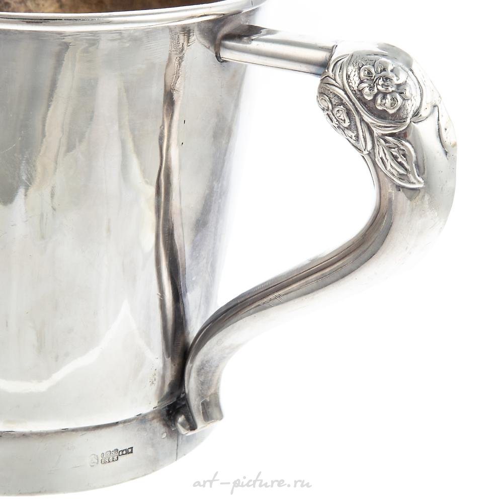 Jan Biedgunowski assay mark, Warsaw, 1863, 84 silver standard. Wide cylindrical form, with a pair of cast handles with floral and foliate decoration, with Cyrillic and Hebrew inscription "In memory of my father Dr. V.L. Kogan, 1840-67, from the region of the city of Kiev, from his children," 5 1/2 in. H, 5 3/4 in. Diam., 8 in.