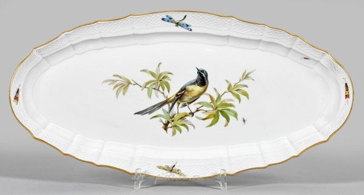 Овальная, изогнутая и изящно изогнутая форма с рельефным декором "Альтозир". В центре изображена серая трясогузка, сидящая на ветке, окруженная отдельными летающими насекомыми в полихромной живописи. Золотой край. Марка в виде перекрестных мечей. Размеры: 54,5 см х 26,5 см. Происхождение: Из наследия значительной северогерманской частной коллекции. Фарфоровая подающая тарелка с декором в виде птицы. Марка в виде перекрестных мечей. Мейсен. Период создания: 1850 - 1924 гг.
