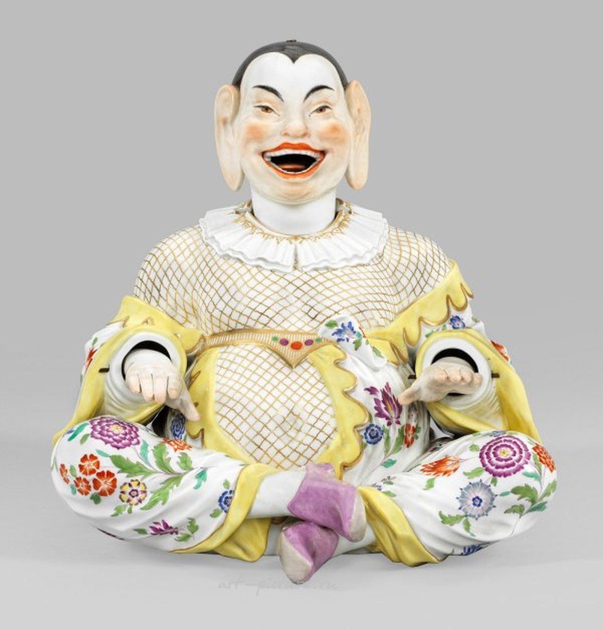Сидя с перекрещенными ногами, изображен полный китаец в белой одежде, украшенной индийскими цветами, с рубашкой, напоминающей сетку, и золотым кружевным воротником, а также с поясом, украшенным драгоценными камнями, и фиолетовыми туфлями. Руки, голова и язык подвижны. Полихромная живопись украшена золотыми акцентами. Возможно, это работа Иоганна Иоахима Кендлера. Мечевая марка. Высота: 33 см. Так называемые "Wackelpagoden" (качающиеся пагоды) можно проследить до дизайнов 1762 года, когда Фридрих II Прусский заказал "10 бажоденов с покачивающимися головами". Пять женских и пять мужских фигур были установлены как часть интерьера Китайского дома в Санссуси после окончания Семилетней войны. См .: Каталог Королевской Саксонской фарфоровой мануфактуры, 1904 г., стр. 27; Рюккерт, Баварский Национальный музей, № 1027; Питч, Триумф, стр. 144. Большая фарфоровая фигура мужской пагоды-качалки. Марка перекрещенных мечей. Мейсен. Около 1935-1945 гг.
