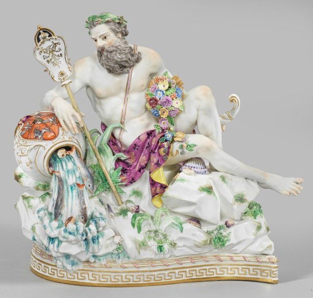 Впереди находится изогнутая основа с рельефно-украшенным меандром и каймой. На сильно рельефной скале, украшенной ракушками, монетами, папоротниками и водными растениями, сидит полностью бородатый и коронованный старый бог реки, с флористически узорчатым пурпурным покрывалом в качестве аллегории Волги, опираясь своей правой рукой на балюстровую вазу, из которой стекает вода вместе с ракушками и рыбами. На вершине вазы находится коронованный рокайль-рамка Польско-Литовского королевского герба с гербом Саксонии. В его правой руке он держит весло с золотым орнаментом, а в левой - рог изобилия с вылепленными цветами. Полихромная живопись с золотым стаффажем. Возможно, это работа Иоганна Иоахима Кендлера, 1772 год. Модель № 235. Восстановлено; мечевая марка. Высота 32 см. 35 см x 19 см. Великолепное изображение группы фигур, созданное Иоганном Иоахимом Кендлером из так называемого "Великого Русского Ордена" для императрицы Екатерины II Российской, известной как Екатерина Великая. Заказ, состоящий из множества аллегорических и мифологических фигур и фигурных групп, является самым обширным среди всех подарков и заказов для двора царя и служит для обустройства павильона в парке дворца Ораниенбаум, ныне Ломоносов. Иоганн Иоахим Кендлер создал дизайны для всех моделей и частично поддерживал их выполнение Мишелем Виктором Асьером, который работал моделистом на фарфоровой фабрике Мейсен с 1764 года. Кендлер разработал и создал эту группу в начале заказа. В качестве контрпартии он также создал воплощение Днепра в зеркальной композиции в качестве главных рек Российской империи, представляющих важные торговые пути, обещающие процветание и богатство стране. См. Пиетцш, Мейсен для царей, стр. 103, рис. 23. Раннее 20-го века аллегорическая фарфоровая фигурная группа Волги из "Великого Русского Ордена" для императрицы Екатерины II Российской, известной как Екатерина Великая. Незначительно восстановлено. Перекрещенные мечи. Мейсен. Раннее 20-е столетие.