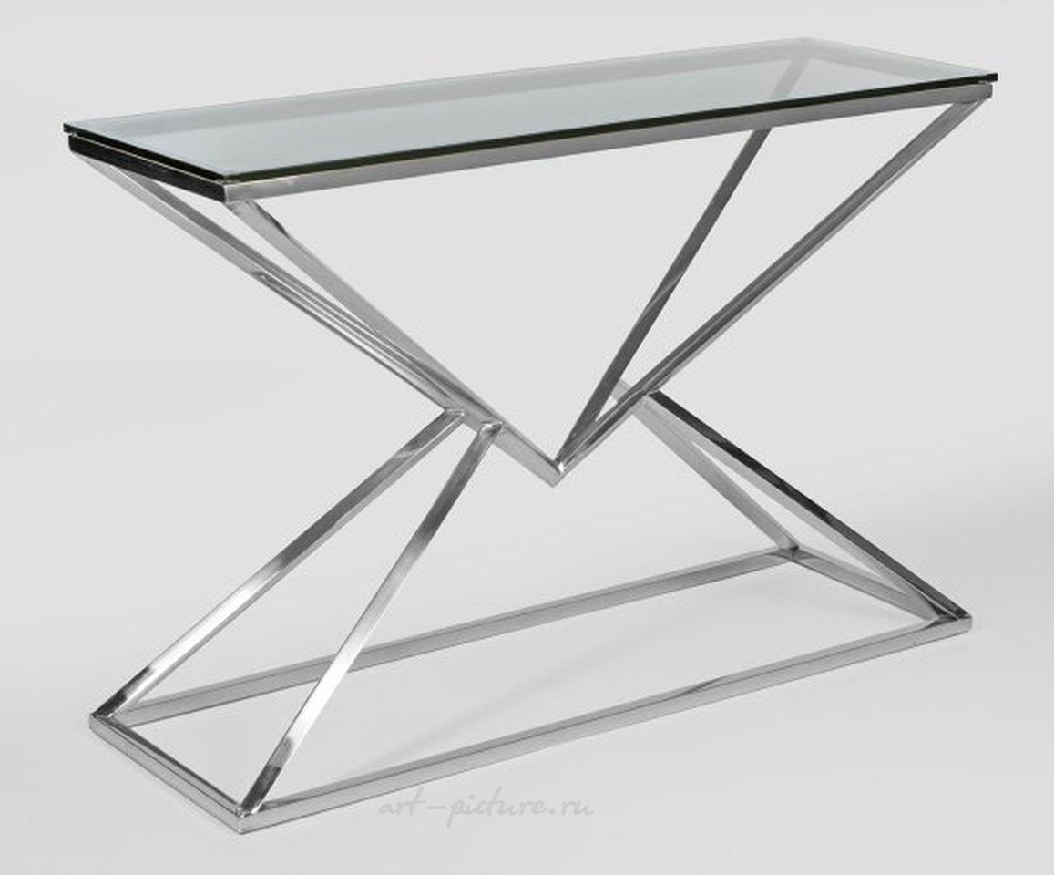 Рама выполнена из узких, фасетированных строительных элементов и перекладин, пирамидально сложенных, служащих опорой для соответствующей рамы и прямоугольной верхней пластины. Высота 81 см. Размеры 120 см x 40 см. Никелированный и стеклянный консольный столик. Франция. Около 2000 года.