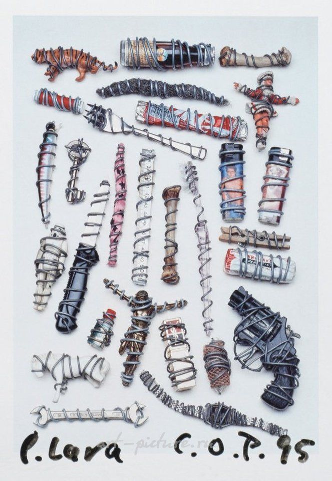 К. О. Паффген (1933 Кельн - 2019 там же) Цветная офсетная печать / фотобумага без названия, 1995. Ниже моногр. и дат. а также без. "П. Лара". Изображение 21 см х 14,9 см. Размер листа 42 см х 29,7 см. Оформлять. Из известной серии работ Паеффгена по обертыванию, в которых Паеффген находит находки и/или предметы. Предметы повседневного обертывания проволокой и представления их в новом контексте. Цветной офсетный отпечаток на фотобумаге. С монограммой, датированной 1995 годом и надписью "П. Лара".Рис. в Интернете