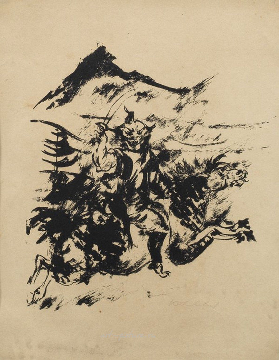 (1893 Берлин - 1971 Швайнфурт) Самурай на коне, литография / Бумага. Р. и подпись; Лист приблизительно 35 х 27 см. Обрамленный. Литография на бумаге. Подписано от руки.
