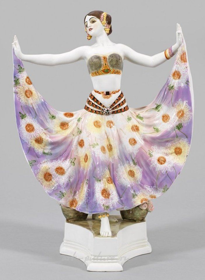 Штейнгут. На трехступенчатом пьедестале изображение шагающей танцовщицы Рут Сен-Дени в открытом животе, в восточном костюме, во время исполнения своего танца "Радха" ( "Танец пяти чувств", премьера 1906 года). За ней на пьедестале две корзины с розами. Полихромная подглазурная роспись. Модель № 3992, разработана около 1911/1912 года. Состояние: с небольшими сколами глазури. Маркировка: "Розе", марка мануфактуры с надписью "Сделано в Австрии"; маленькая пресс-марка с неразборчивым монограммой. Высота 53,5 см. Знаменитая американская танцовщица Рут Сен-Дени (1879-1968) показала свое представление "Радха" во время своего европейского турне 1906-1909 годов с огромным успехом, в том числе в Париже, Берлине и Вене. См. Dechant / Goldscheider, стр. 379 с иллюстрацией; большая фигурка "Рут" Гольдшайдера, изображающая известную женскую танцовщицу Рут Сен-Дени, создана примерно в 1911/1912 году. Полихромная роспись и глазурованная керамика. Незначительные реставрации, небольшие сколы глазури. Марка производителя. Австрия. Вена. Фридрих Гольдшайдер. Около 1922-1930 года.