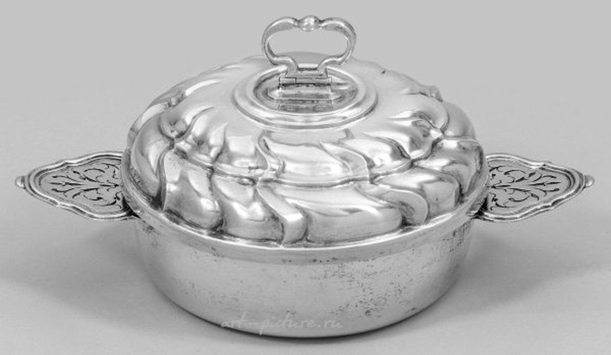 Серебро. Близко к цилиндрическому, гладкому корпусу с боковыми плоскостями, орнаментально проработанными и плавно изогнутыми ручками. Выпуклая крышка с шарнирной ручкой, сделанная в рельефно-пластическом стиле. Внутри позолочено. Автор - мастер Эмануэль Дрентветт (мастер с 1713 года). Вес около 405 г. Высота 11 см. Диаметр чаши 13 см. См. Селинг 2007, номер 2056, БЗ 2000. Немецкая барочная серебряная чаша с крышкой от Эмануэля Дрентветта (мастер с 1713 года). Внутри позолочено. Испытание, пробирное и мастерская маркировка. Город Аугсбург. 1747-1749 гг.
