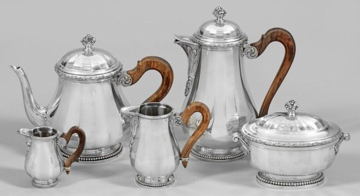 Серебро. Комплект из пяти предметов: кофейник, чайник, молочник, сахарница и сливочник. Корпус имеет форму груши, покрытую перламутровым эмалем, гладкую и декорированную тонкими вертикальными фасетками. Крышка с шарнирным механизмом имеет форму купола и украшена рельефным венком из лавровых листьев. Наверху находится пластичная ручка в форме бутона с пышной виноградной лозой и листвой. Профилированный край корпуса переходит в клювообразный выступающий консольный носик, частично покрытый цветочными чашечками и листьями аканта. Деревянная ручка в форме уха, у основания которой расположена розетка, оформлена цветочными чашечками, расположенными по солнцеподобному принципу. Маленький сливочник имеет отличающуюся форму и декор. Маркировка, показатели пробы, марки производителя. Вес около 2750 г. Высота 9 см - 24 см. Изысканный и полный комплект французского серебра из пяти предметов для кофе и чая с деревянными ручками. Маркировка и марка производителя. Франция. Париж. Эмиль Пуифорка. 20 век.